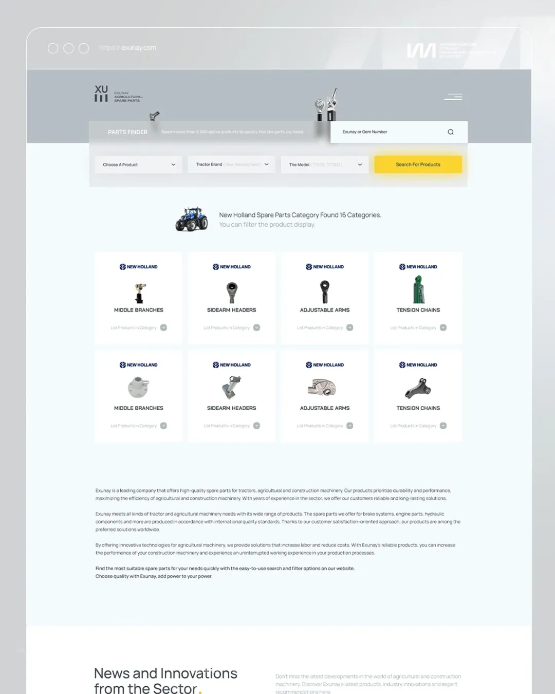 Tarım makineleri ve yedek parça sektörü, görselliğin teknik verilerle (milimetreler, basınç değerleri, parça uyumlulukları) kusursuz bir uyum içerisinde sunulmasını gerektirir. EXUNAY için gerçekleştirdiğimiz web tasarım çalışmasında, bağlantı sistemlerinden asansör tertibatlarına kadar her ürün grubunu, markanın kalite standartlarını yansıtacak şekilde dijital ortama aktardık. Kurumsal web sitesi kurgulanırken, ziyaretçilerin hidrolik silindirler veya kabin aksamları gibi karmaşık parçaları saniyeler içinde bulabileceği bir yapı hedeflenmiştir.