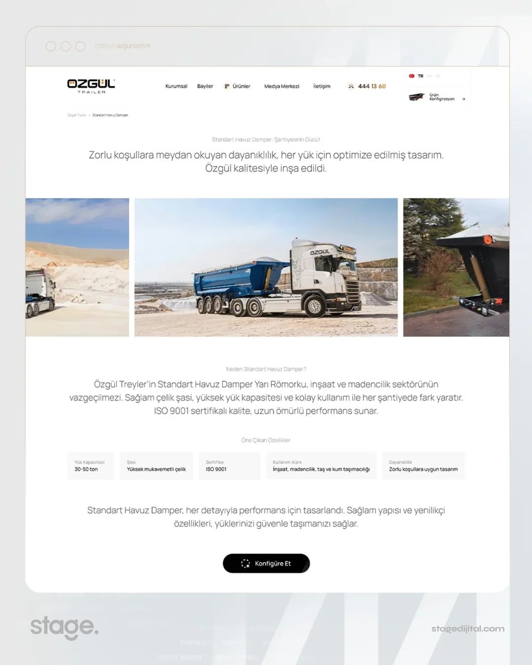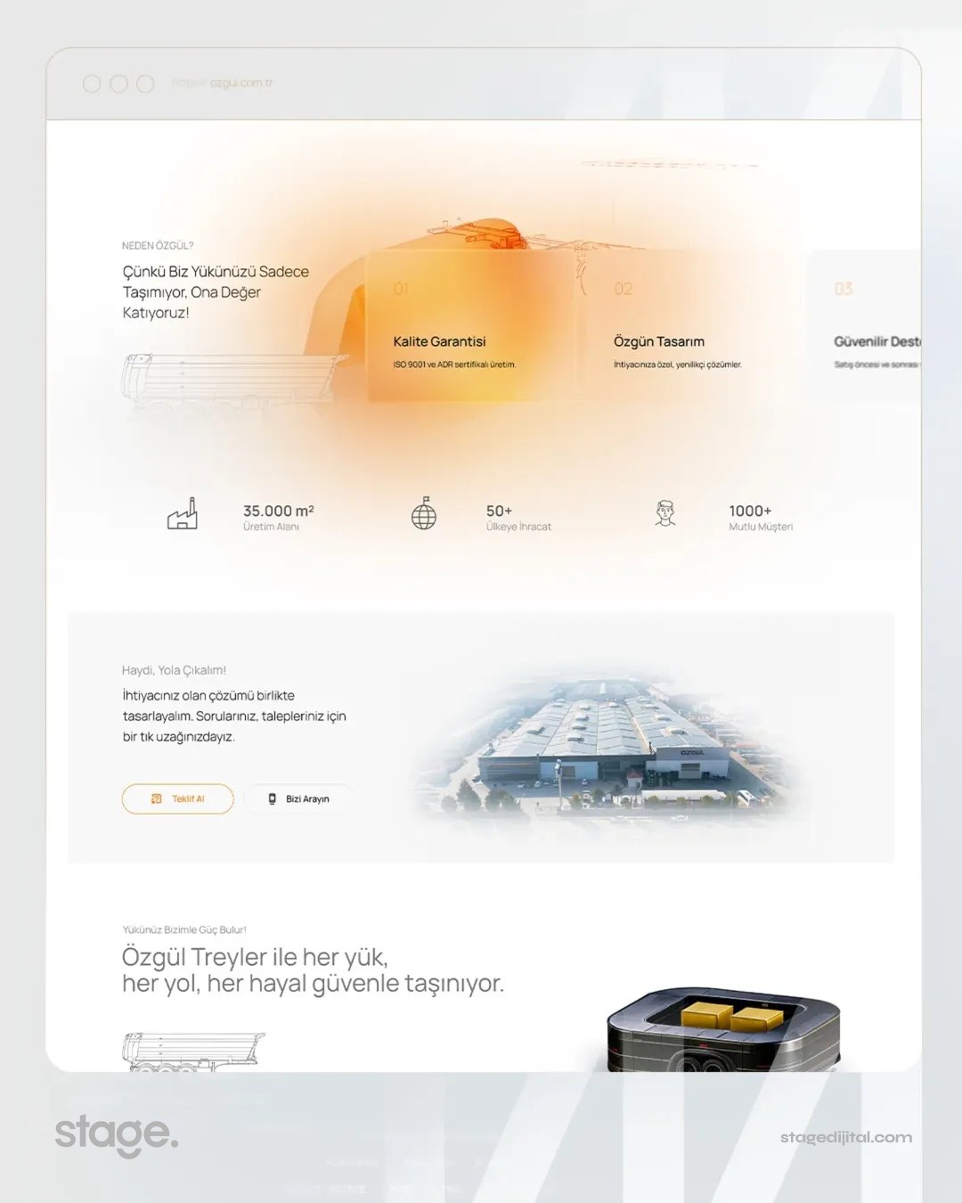 Stage Dijital tasarım ekibi, Özgül Treyler’in global kurumsal kimliğini modern arayüz trendleriyle birleştirerek sektöre tam uyumlu bir dijital yapı oluşturmuştur. Bu tasarım anlayışı, markanın sadece bir üretici değil, aynı zamanda lojistik ve taşımacılık sektöründe dünya standartlarında bir çözüm ortağı olduğu imajını pekiştirmektedir. Sitede kullanılan tipografi ve renk paleti, markanın ciddiyetini ve kalitesini dijital ortama yansıtmaktadır.