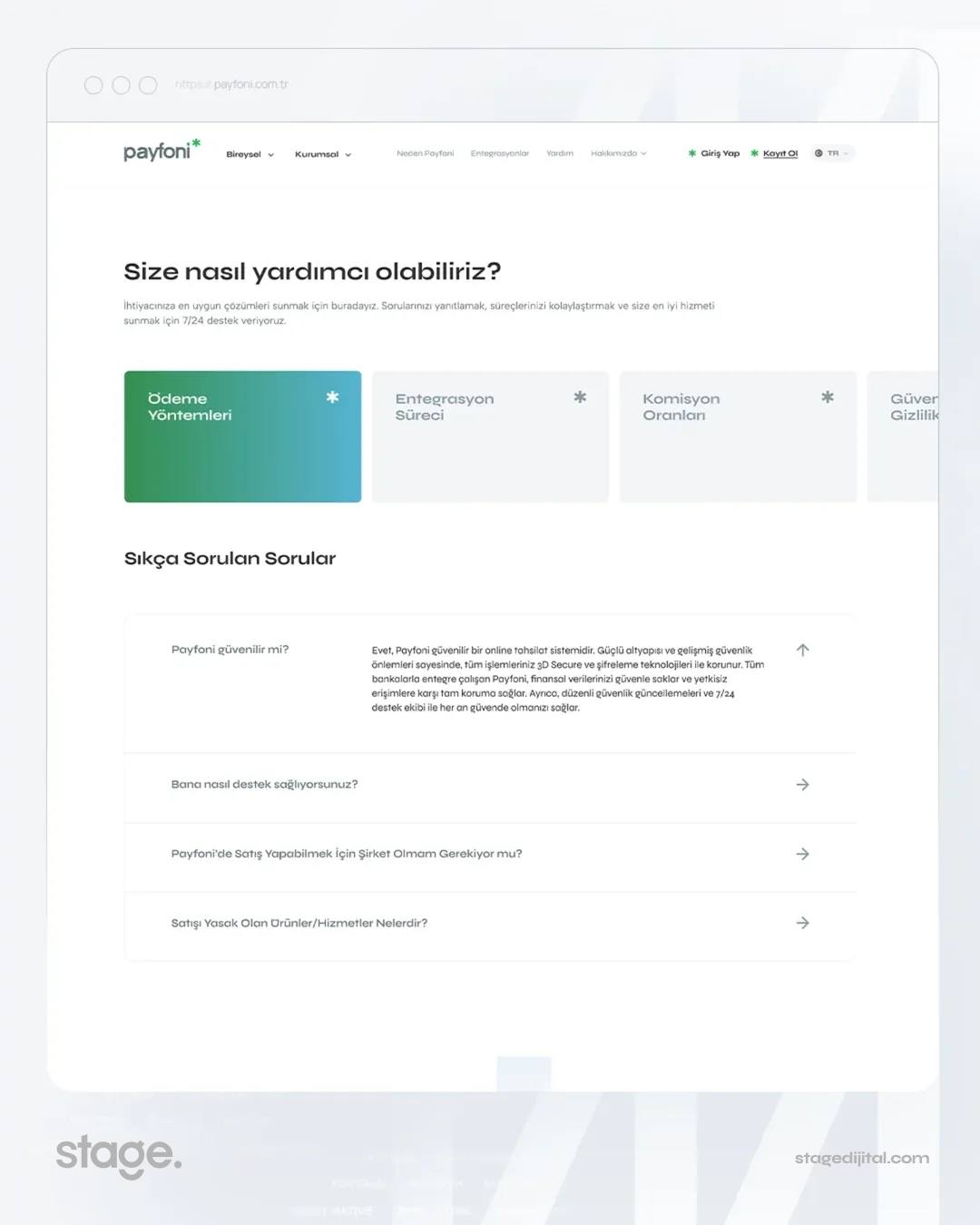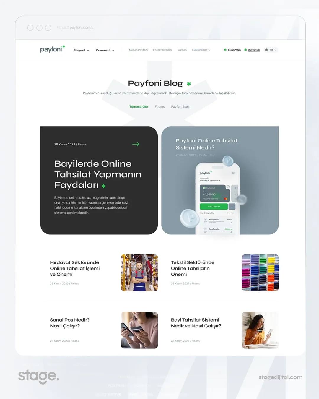 Payfoni’nin finansal çözümlerini ve teknolojik altyapısını; modern, güven odaklı ve kullanıcı dostu bir kurumsal web sitesi tasarladık ve Stage Dijital imzasıyla web ortamına taşıdık.