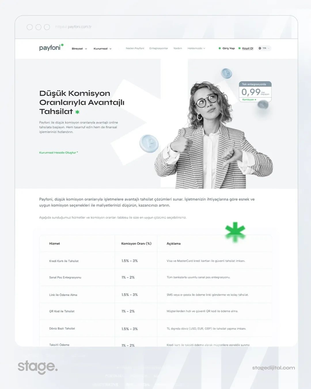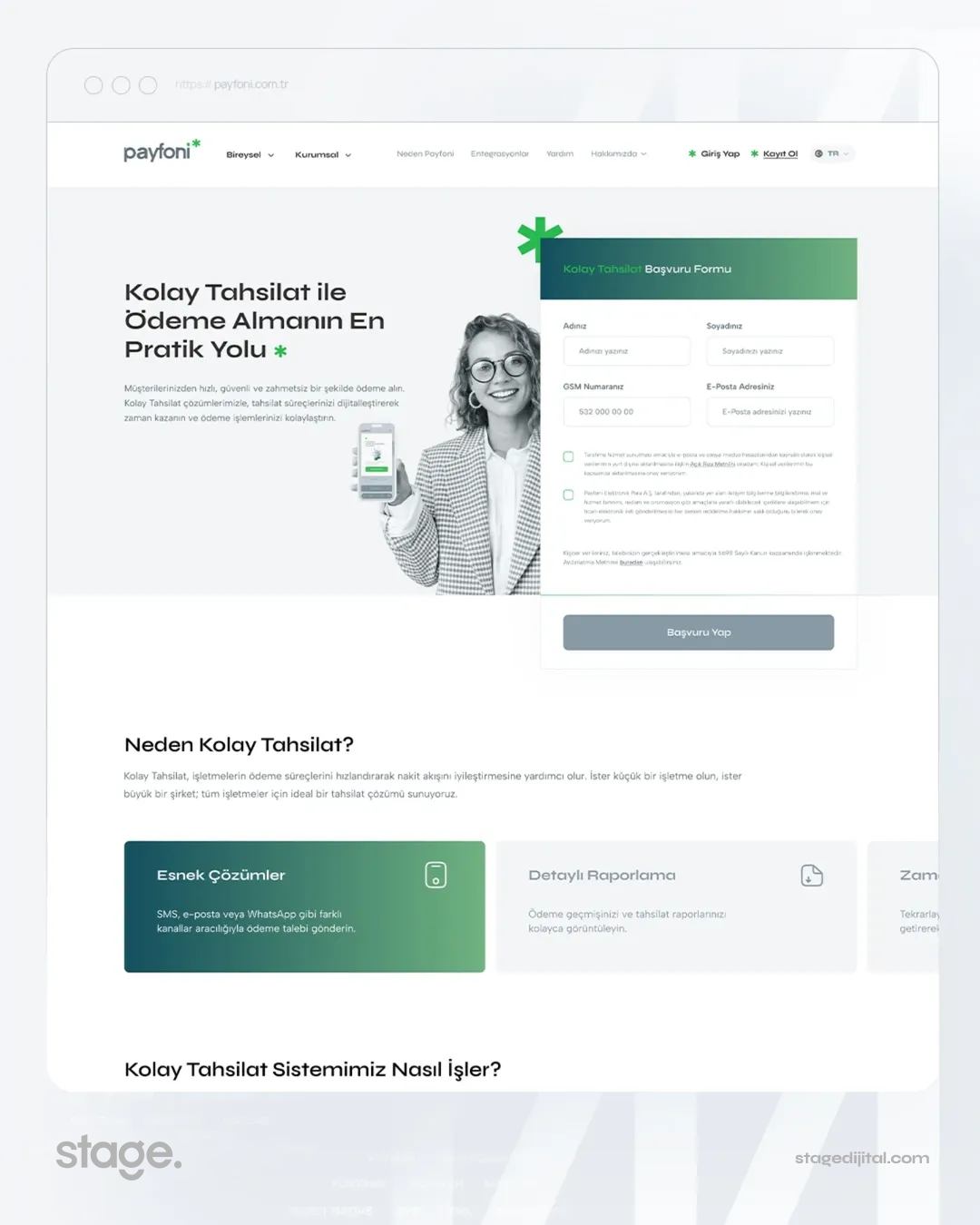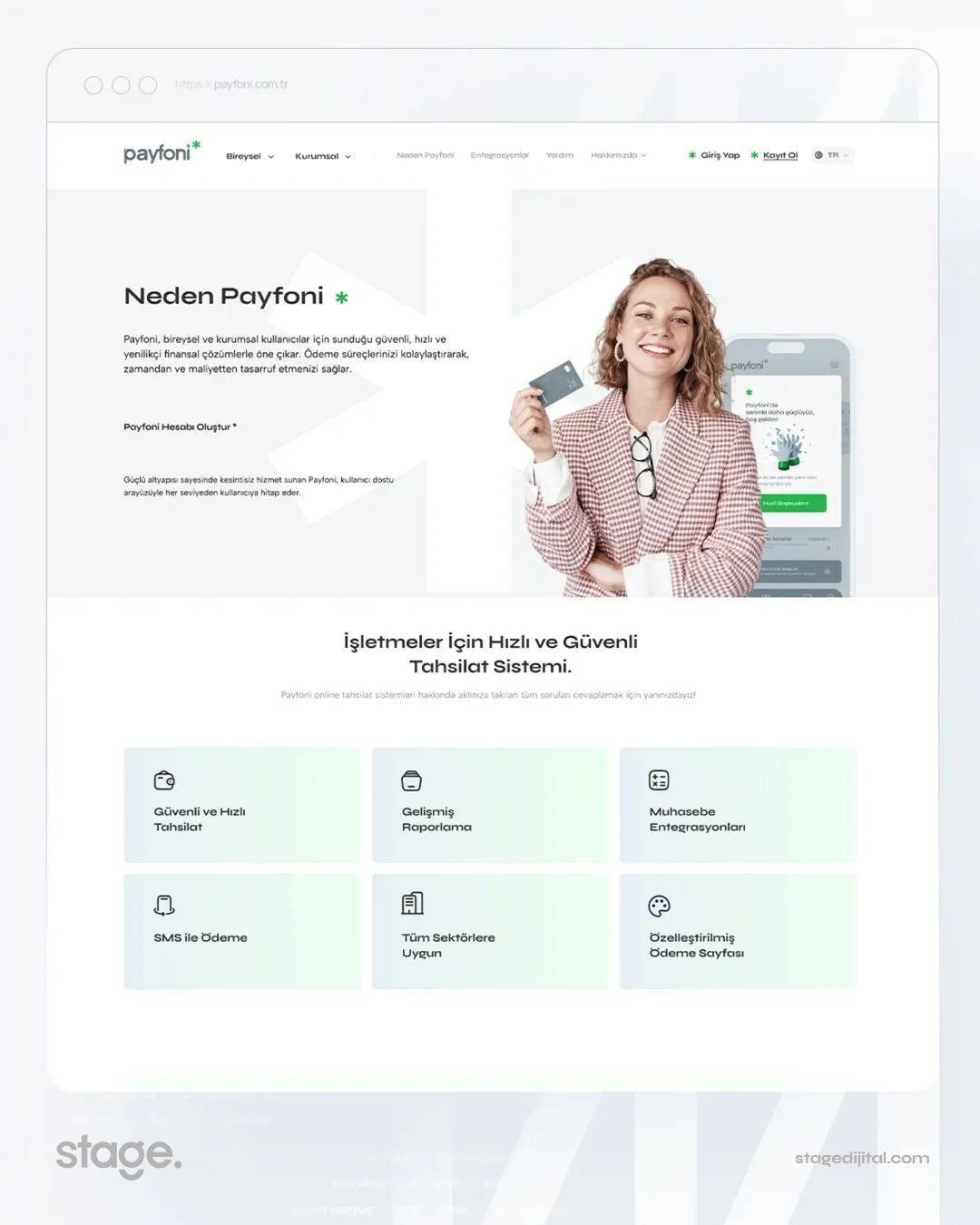 Stage Dijital tasarım ekibi, Payfoni’nin teknolojik vizyonunu dijital dünyanın en güncel trendleriyle birleştirerek sektöre tam uyumlu bir arayüz oluşturmuştur. Bu tasarım anlayışı, markanın sadece bir ödeme sistemi değil, aynı zamanda işletmeler için stratejik bir teknoloji ortağı olduğu imajını pekiştirmektedir. Sitede kullanılan net hatlar ve kurumsal renk uyumu, markanın ciddiyetini dijital dünyada temsil etmektedir.